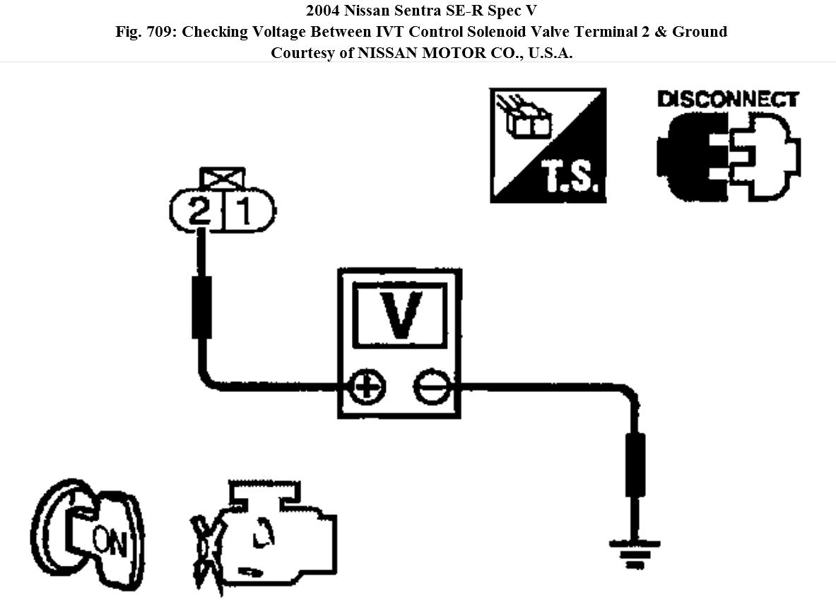 D) Check voltage between intake valve timing control solenoid valve terminal 2 and ground with CONSULT-II or tester.