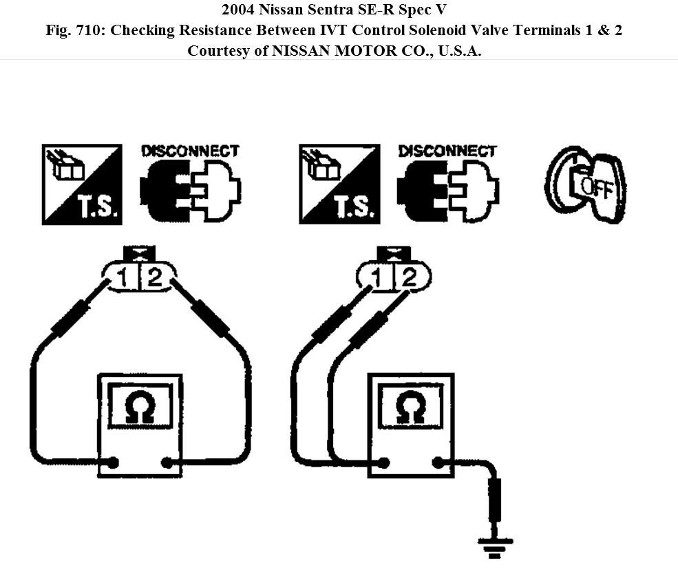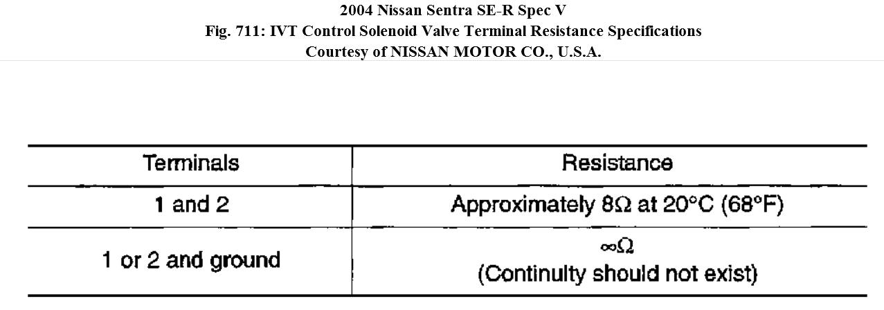 2. Check resistance between intake valve timing control solenoid valve terminals 1 and 2 under the following conditions.