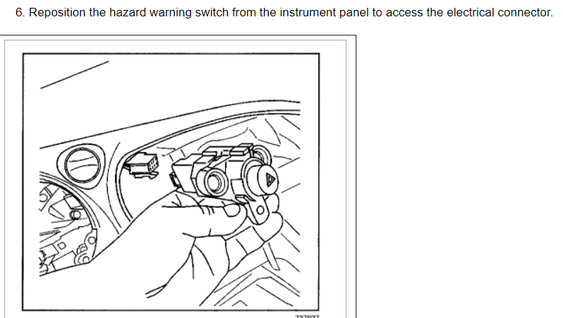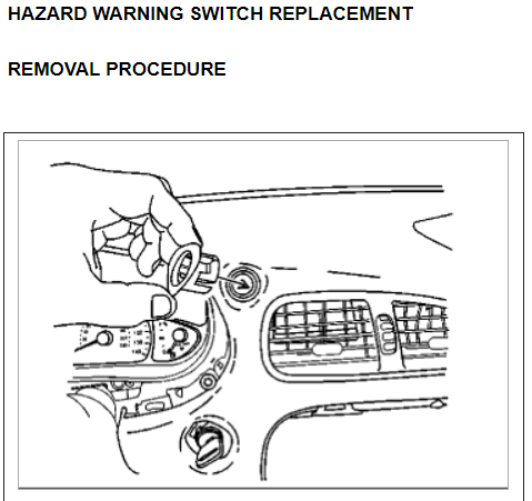Remove the hazard warning switch bezel from the instrument panel (I/P) using a small-flat bladed tool to release the retainers. Remove the I/P center air outlet. Remove the I/P cluster. Remove the left side bolt from the hazard warning switch through the instrument panel cluster pocket. Remove the right side and center lower bolts from the hazard warning switch through the center air outlet opening. Reposition the hazard warning switch to the center air outlet opening. Disconnect the electrical connectors from the hazard warning switch. Remove the hazard warning switch from the I/P.