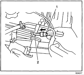 Connect the quick-connect fitting of the fuel feed hose (1) to the fuel feed pipe (2) of the fuel rail.