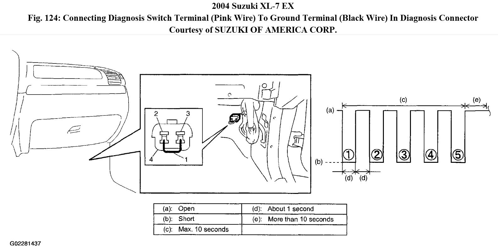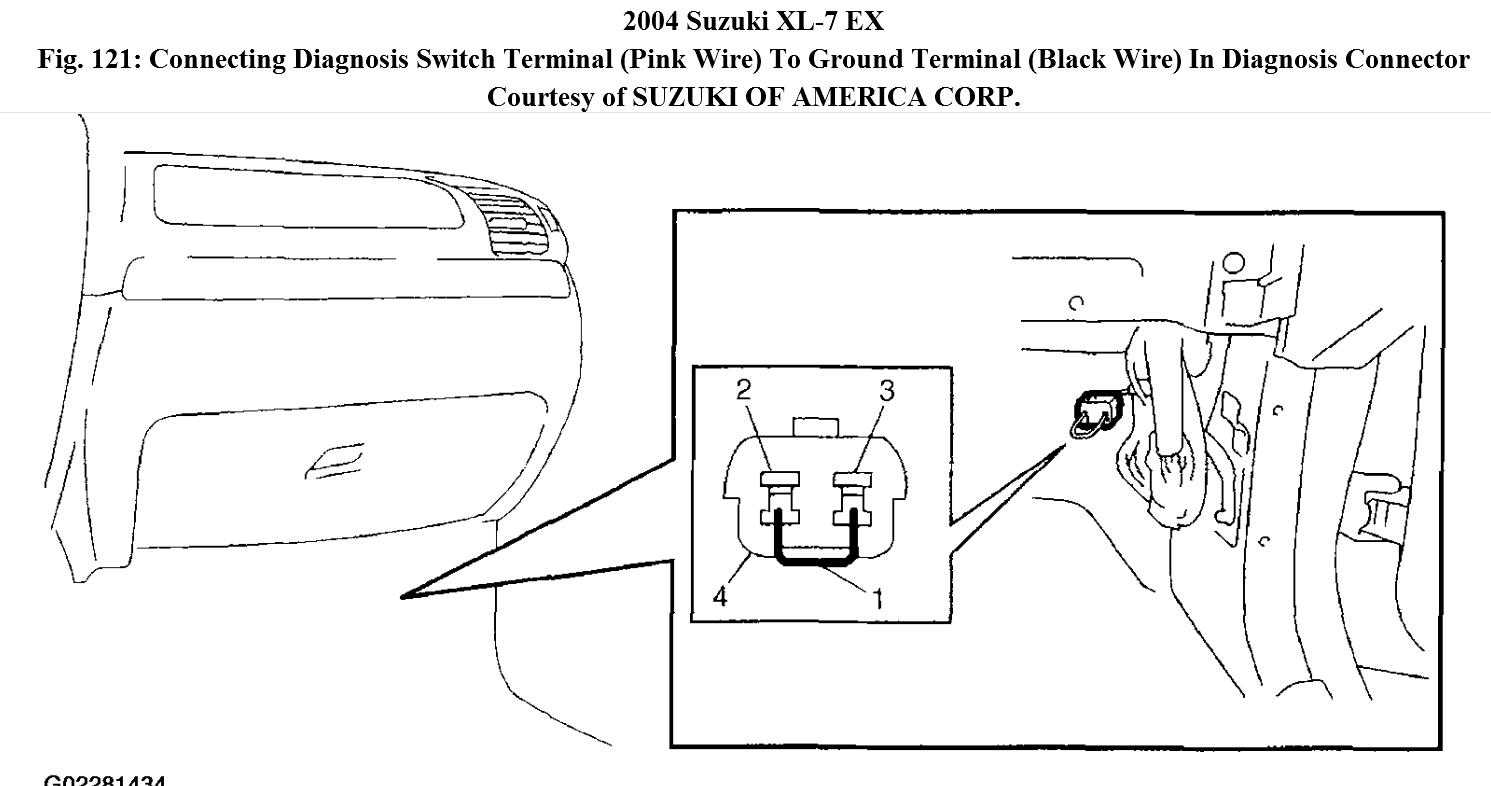 2. With ignition switch OFF position and using service wire (1), connect diagnosis switch terminal ("PNK" wire) (2) to ground terminal ("BLK" ire) (3) in diagnosis connector (4).