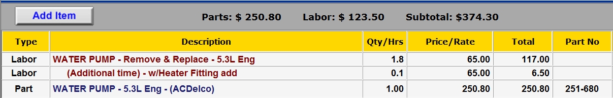 I need to replace the water pump on my 2005 chevy avalanche 1500 with 5.3 L engine. How much will it cost for parts, coolant and labor?