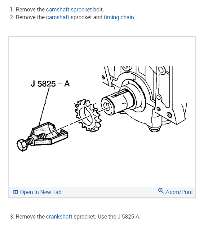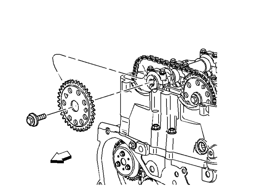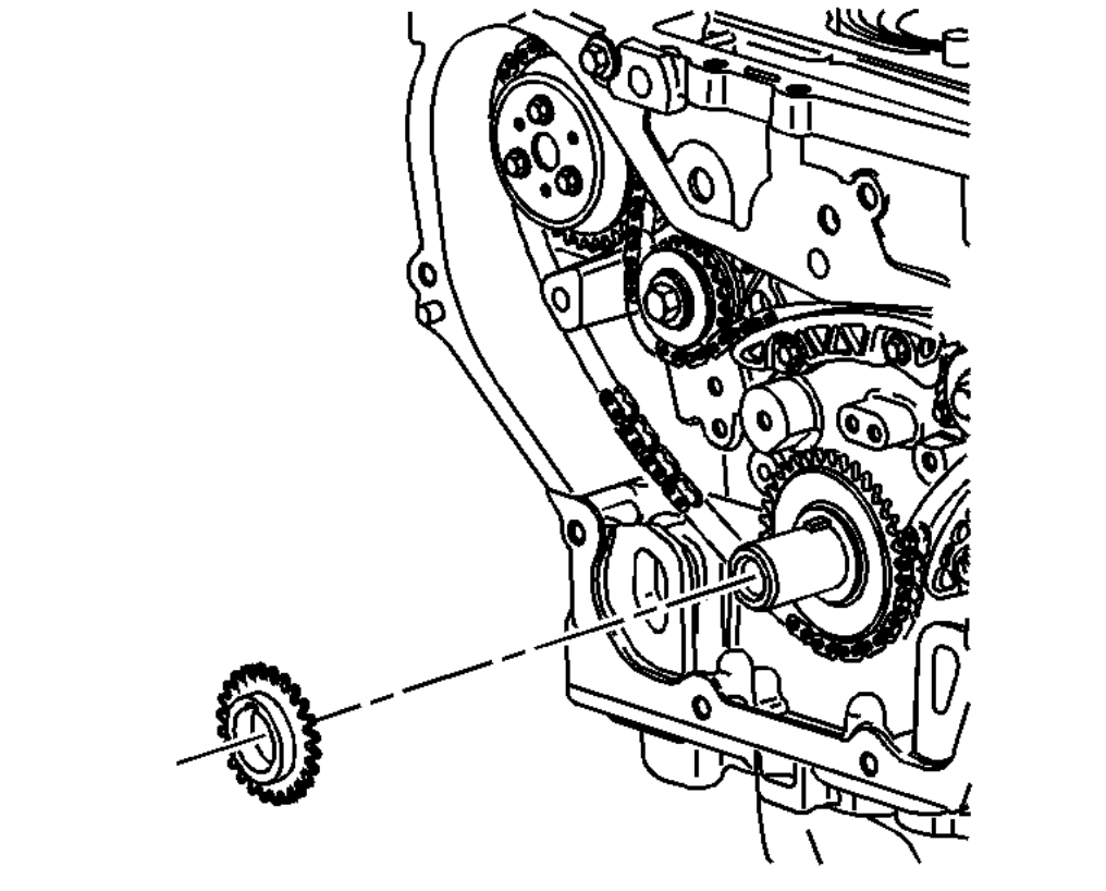 CAUTION:To prevent damage to sprocket or timing chain housing, use a puller to remove sprocket from camshaft. DO NOT pry sprocket from camshaft.