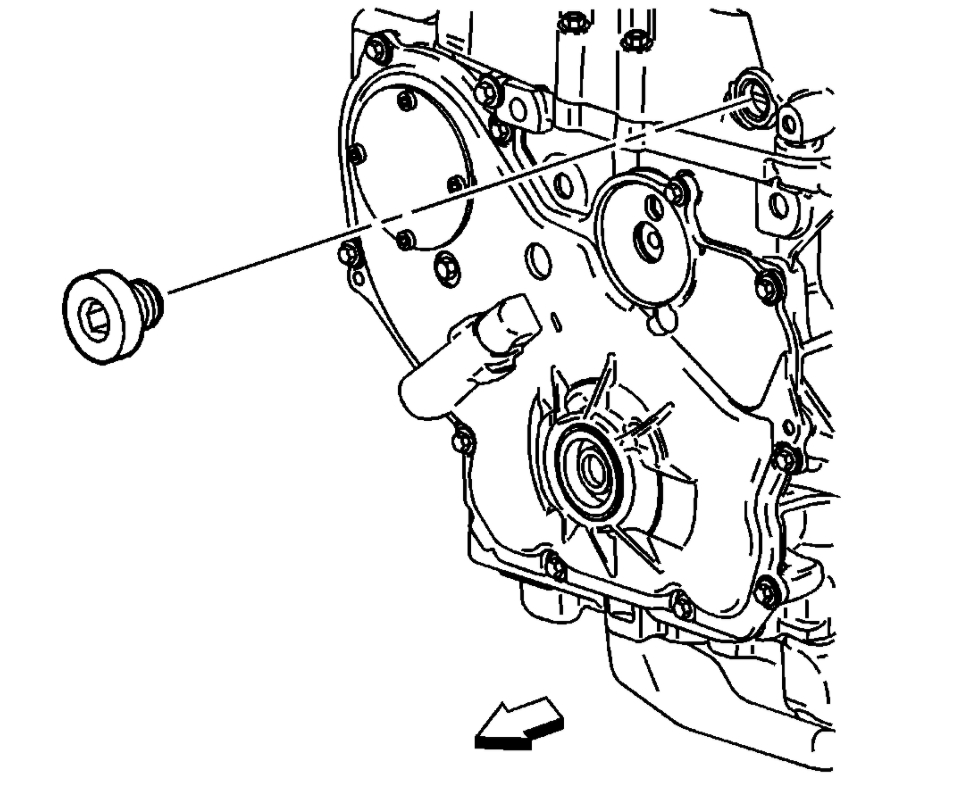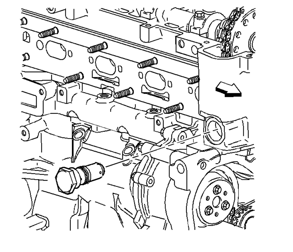 NOTE:Ensure camshaft sprocket alignment pins are in the cylinder block and the timing chain housing, prior to installing the timing chain housing. The camshaft sprocket alignment pins ensure proper chain housing and front cover location for correct front oil seat to crankshaft alignment.