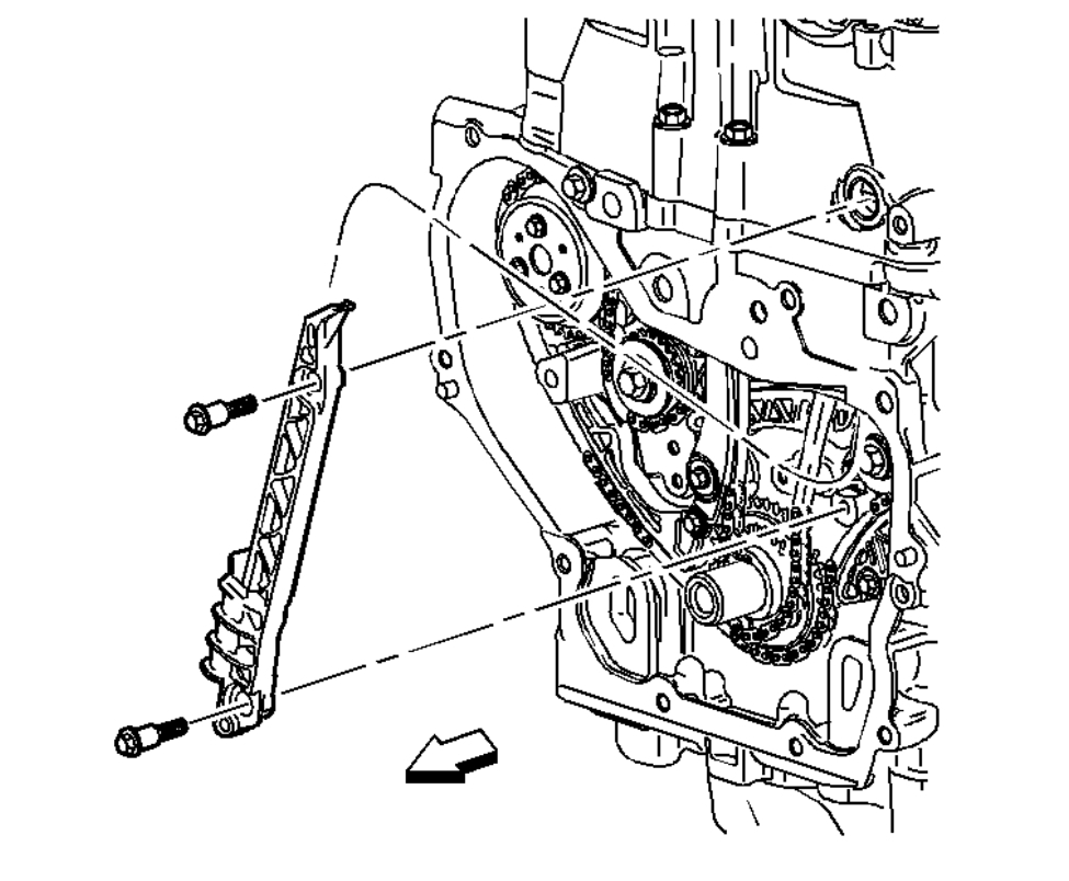 Install Tool (J-36008-A) through the holes in the camshaft sprockets and into the holes in the timing chain housing. This will position the camshaft for correct timing. Use the following steps if the camshafts are out of position and must be rotated more than 1/8 turn in order to install the alignment dowel pins: