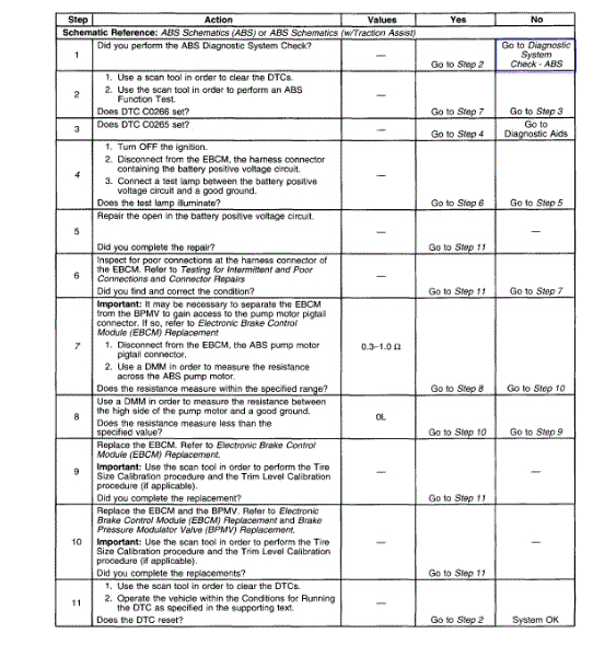 Important: Whenever the EBCM is replaced for DTC C0265 or C0266, the ABS pump motor and motor circuitry must be tested for the proper resistance. Refer to steps 7 and 8 in the diagnostic table below for testing procedures and resistance values.