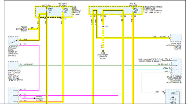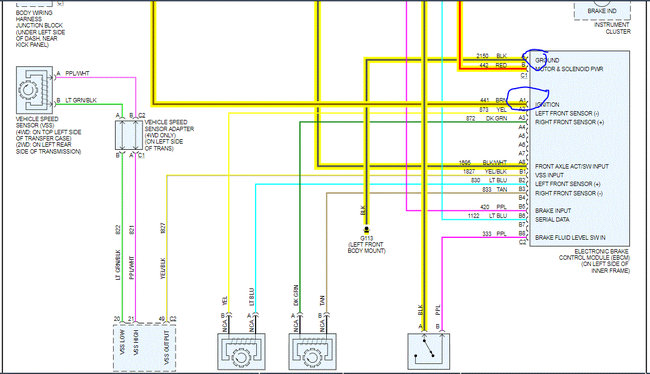 The ABS relay supplies battery voltage to six valve solenoids (RF dump/isolation, LF dump/isolation, and rear dump/isolation). The EBCM microprocessor applies the grounds needed to activate each solenoid. The low side of each solenoid coil has a feedback circuit to the EBCM microprocessor. When a solenoid is commanded OFF, the feedback voltage is high. When a solenoid is commanded ON, the feedback voltage is low.