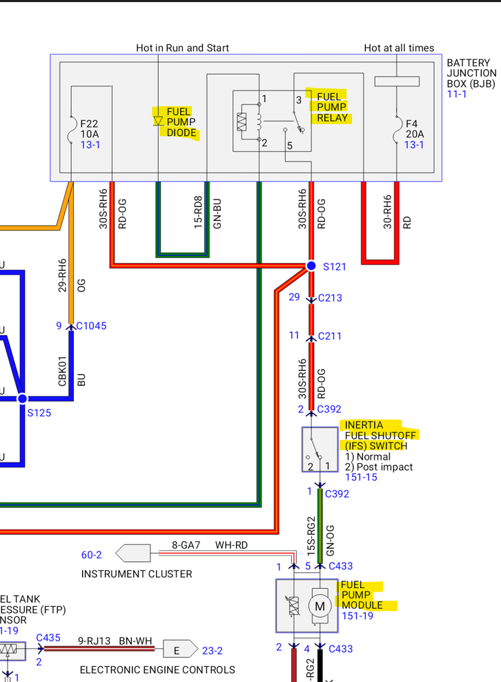 I can try to locate some other diagrams; we just don't have that van listed on all data in the US. I'll try to see what feeds power to that Diode, it's obviously an ignition feed, and Ford always puts their fly back diodes in series with their main relays. Most other manufacturers have them or a resistor built into the relay to prevent the high voltage spike that occurs when the relay is turned off. But if the relay control coil shorted it would take that diode out pretty fast, I actually had a Ford fuel pump relay right here and it read 74 ohms across the 2 control terminals, so 12-volts / 74 gives about 162ma of current flow. So, compare the relay in question with the PCM relay and see what they read just to be sure. You don't want to burn out an ECM driver, let us know what you find. And with the diode out on the bench it should read a resistance in one direction but not the other. So, it will only allow current flow in one direction.