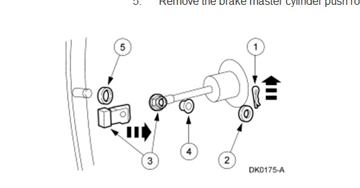 Disconnect the battery. Disconnect the brake pedal position, BPP, switch electrical connector. Remove the BPP switch. #1, remove the self-locking pin. #2, Remove the brake master cylinder push rod spacer. #3, Remove the BPP switch from the brake master cylinder push rod. #4, remove the brake master cylinder push rod bushing. #5, remove the brake master cylinder push rod spacer.