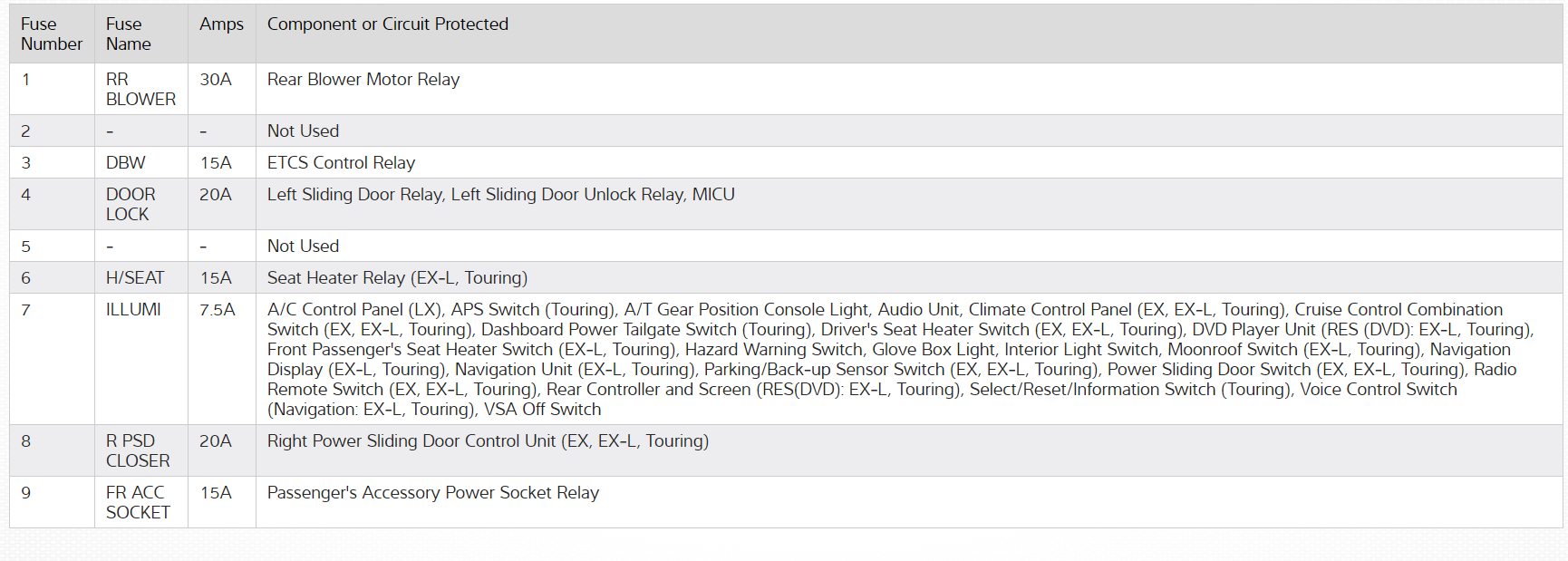 Fuse Number Fuse Name Amps Component or Circuit Protected
