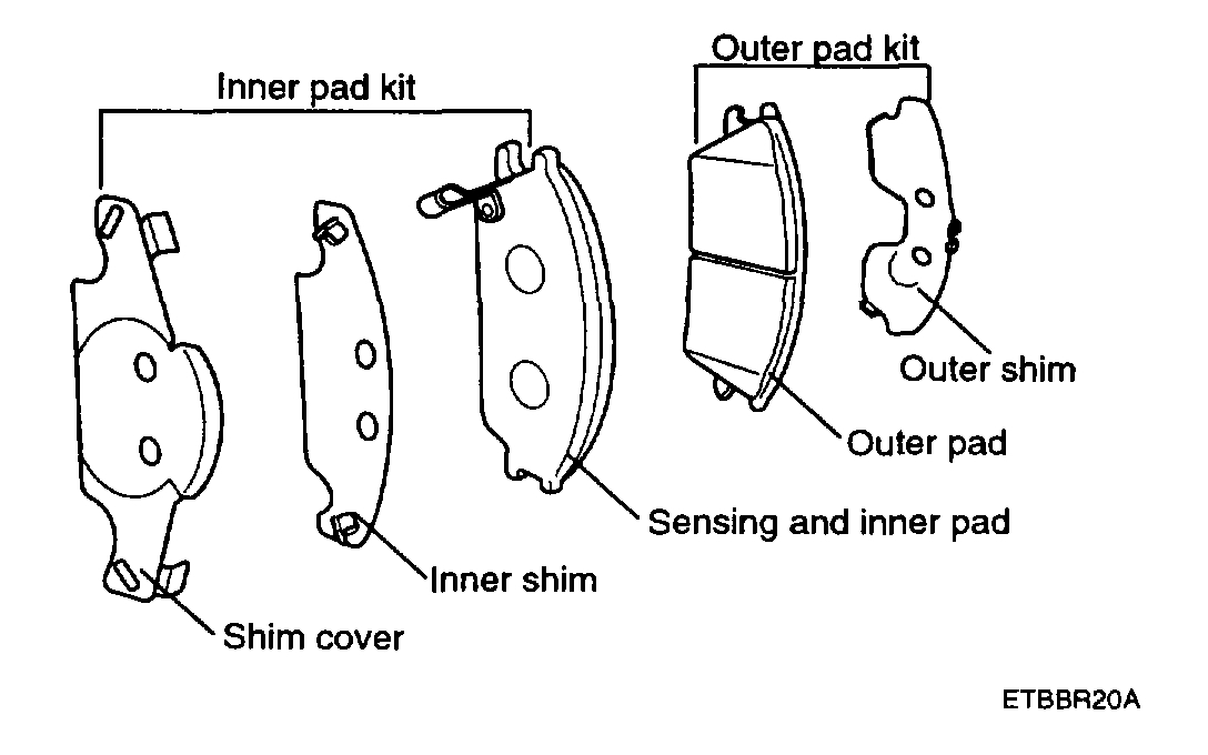 4. Install the new pads. The shims are attached to each pad as illustrated.