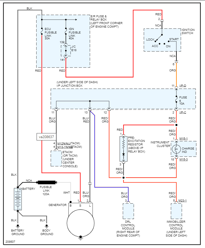 That means we need to run the following tests. Refer to the wiring diagram but we need to check from the battery to the generator on terminal B. You do this by putting one meter lead on the battery terminal and the other lead at the alternator and see how many volts that wire is using. It should be very low. Wiring should not be using much voltage at all so if you have more than a volt then that wiring has high resistance.