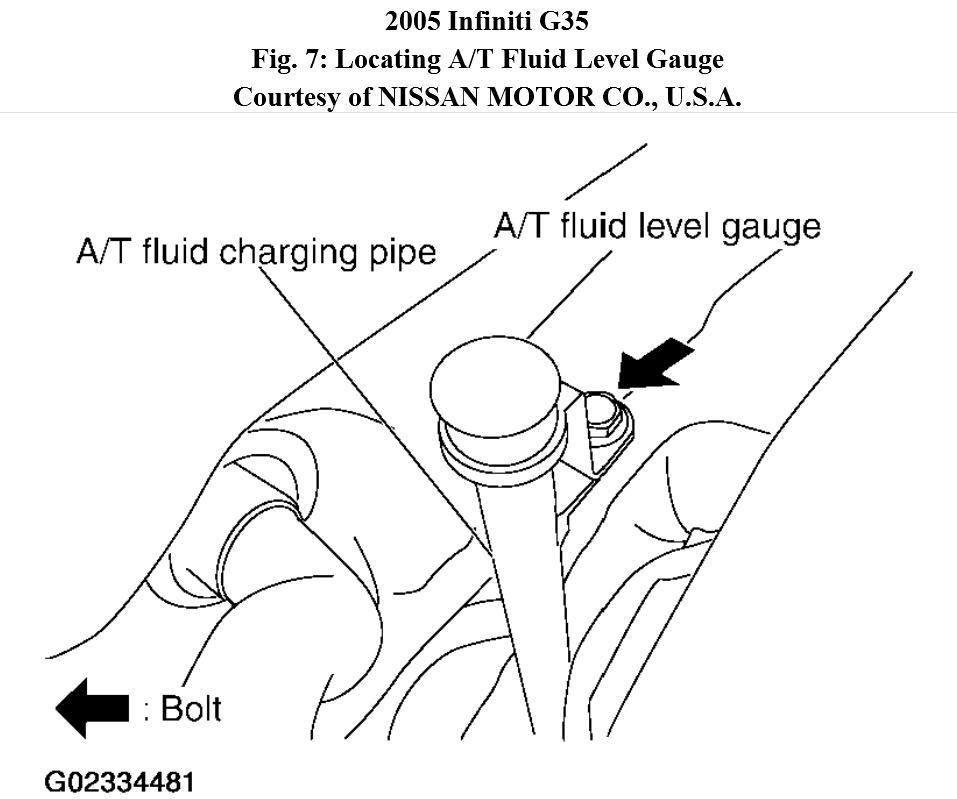 F. Remove A/T fluid level gauge and note reading. If reading is at low side of range, add fluid to the A/T fluid charging pipe.