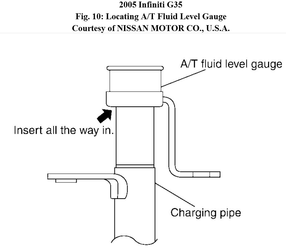 To check fluid level, insert the A/T fluid level gauge until the cap contacts the end of the A/T fluid charging pipe, with the A/T fluid