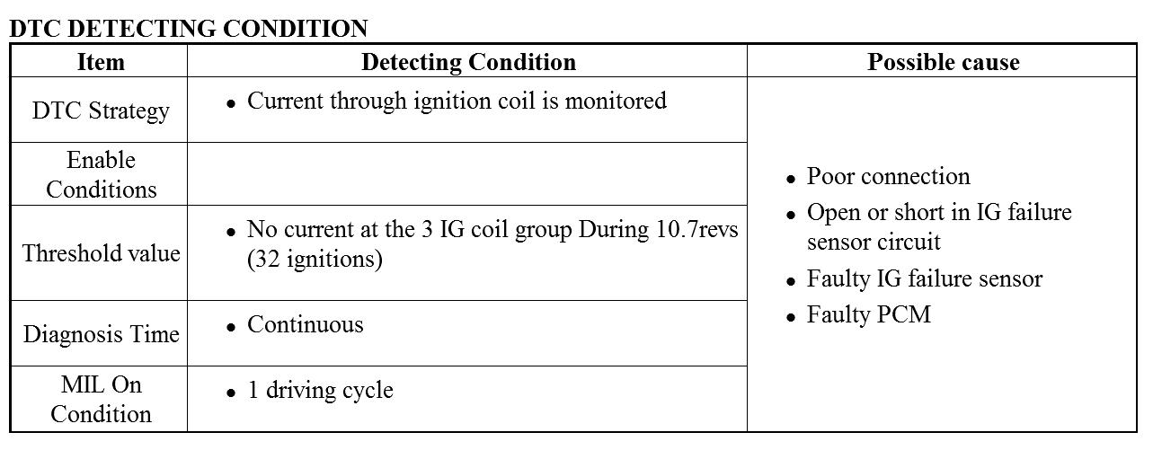 If there is no current at 3 ignition coils group during 32 ignitions, the PCM determines that a fault exists and a DTC is stored.