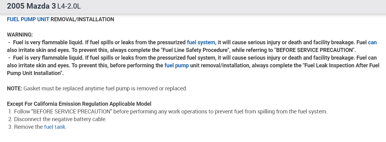 I need instructions on how to replace the fuel pump on 2005 mazda 3 2.3 liter. The check engine light came on several months ago (about 6-8) and I took it in for routine maintenance and had them check it out. I was told the fuel pump was getting "sluggish". For a couple of months now the car has been hard to start after putting gas in and is now stalling at times when sitting at traffic lights, etc.