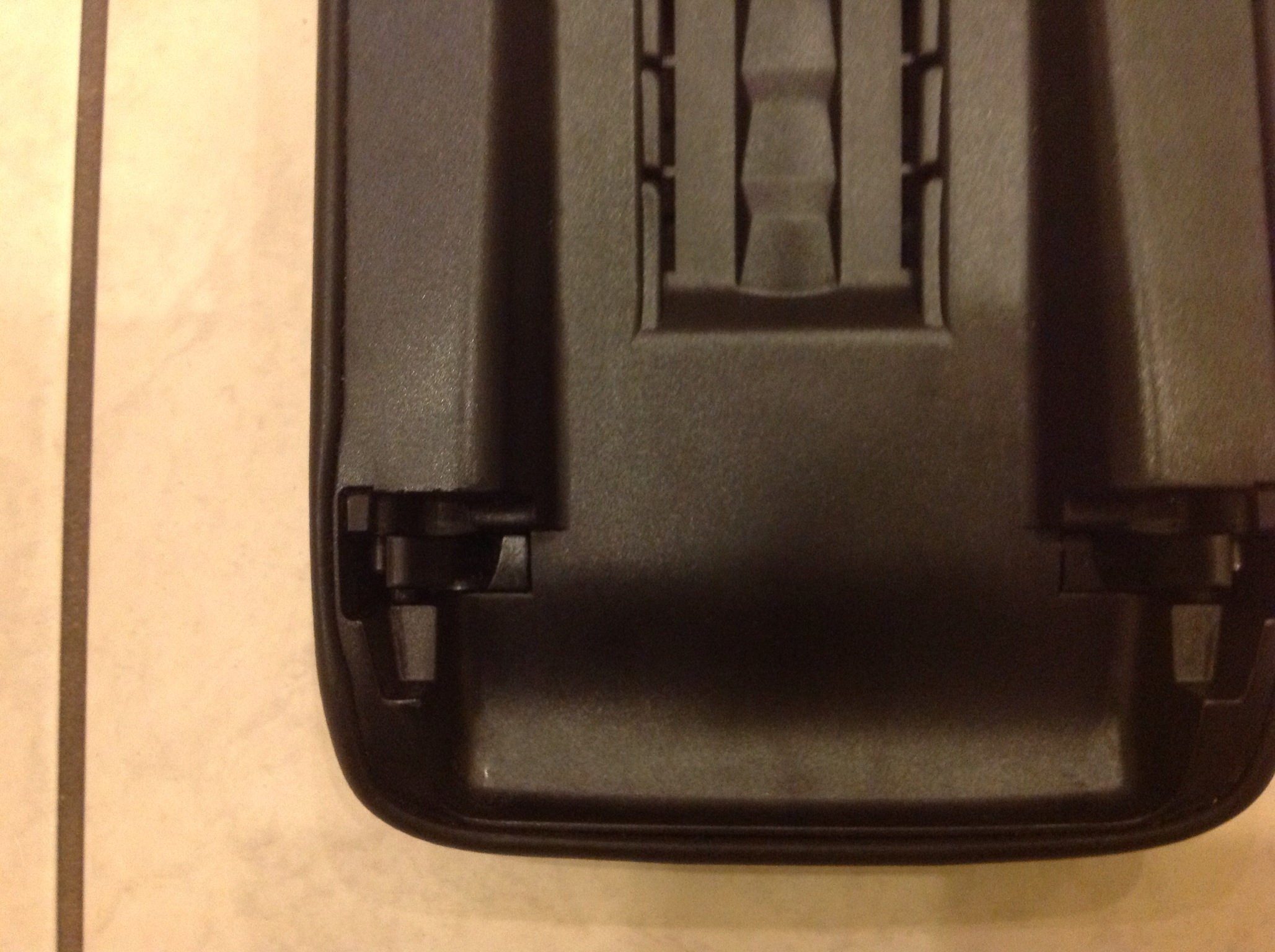 Here is a close up of the back of the arm rest. At the back there are two arms that can move back and snap back in place. This is what holds the arm rest in place. It popped off and now I can not put t back on because the two arm can not be pulled apart