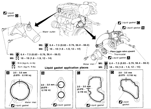 Apply a continuous bead of liquid gasket to mating surface of water inlet.