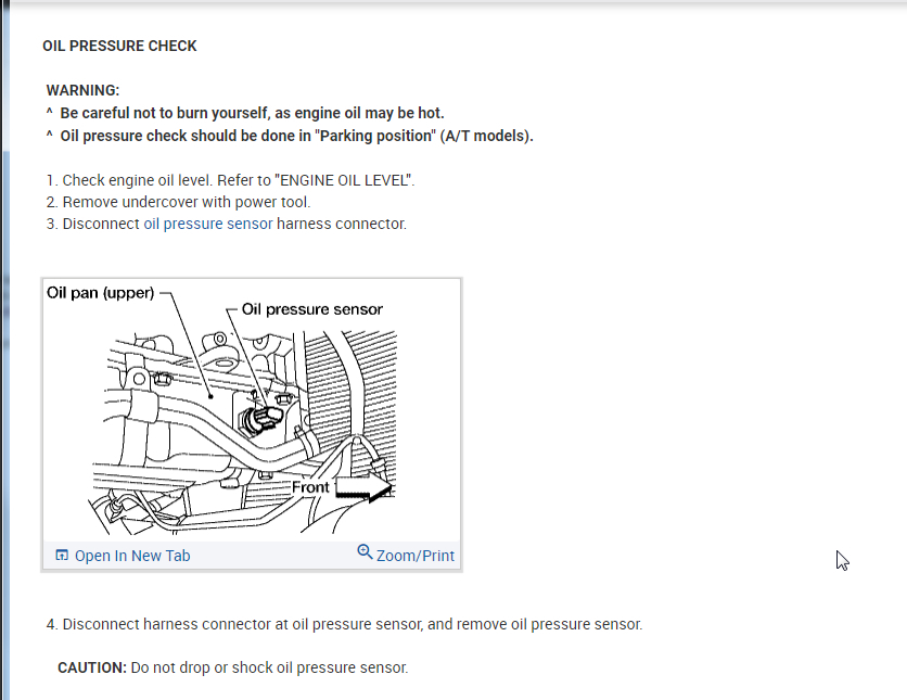 Oil pressure gauge on dashboard pinned at "H". Oil level is good; temperature remains normal when on the road and idling; no fuses blown. What can I check myself before taking it in to Nissan Service? Is there a connection under the hood I can "wiggle" and, if so, where would I find it. Thank you.