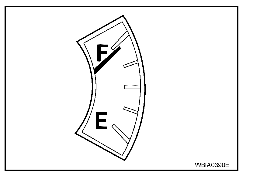 3. Check the fuel level on level gauge. If the fuel gauge indicates more than the level as shown (full or almost full), drain the fuel from the fuel tank until the fuel gauge indicates the level as shown, or less.