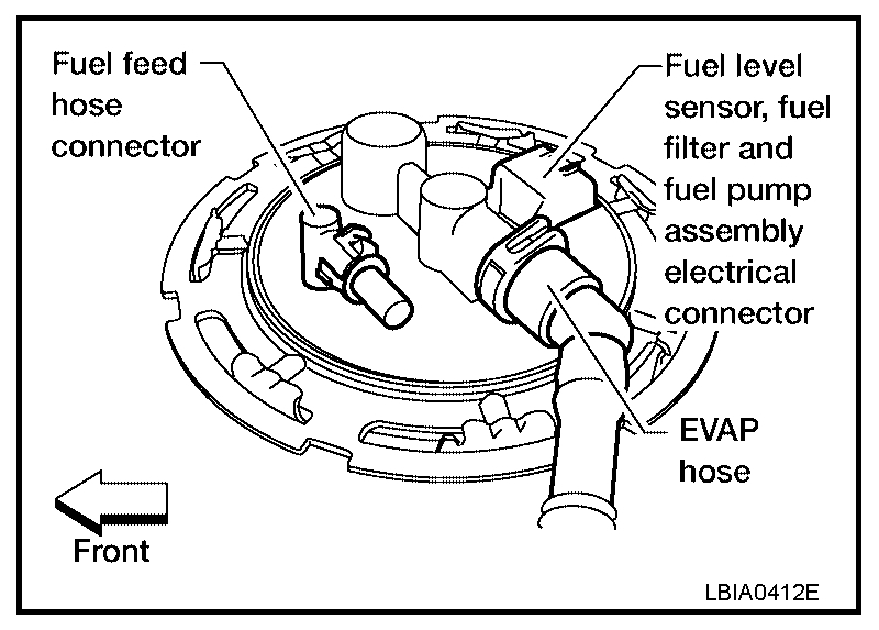 14. Disconnect the EVAP hose from the fuel pump and remove the EVAP hose from the molded clip in the top of the fuel tank.