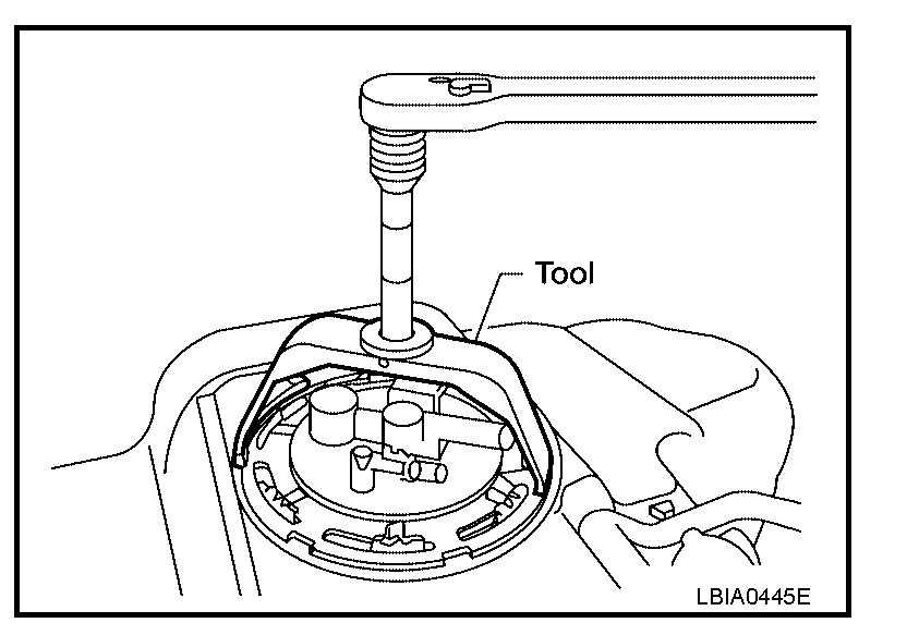 NOTE: Fuel will be spilled when removing the fuel level sensor, fuel filter, and fuel pump assembly for the fuel level is above the fuel level sensor, fuel filter, and fuel pump assembly fuel tank opening.