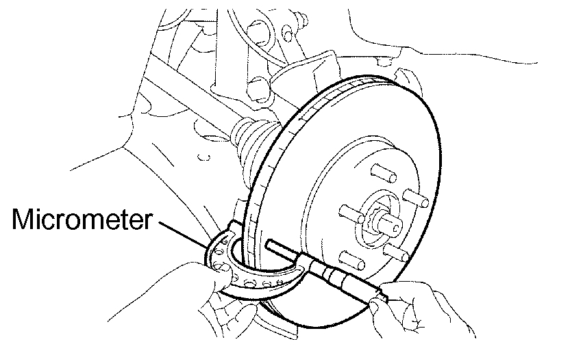 If the runout exceeds the maximum value, change the installation positions of the disc and axle so that the runout will become minimal. If the runout exceeds the maximum even when the installation positions are changed, grind the disc. If the disc thickness is less than the minimum, replace the front disc.