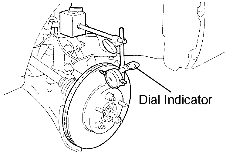 c. Using a dial indicator, measure the disc runout 10 mm (0.39 inch) away from the outer edge of the front disc.