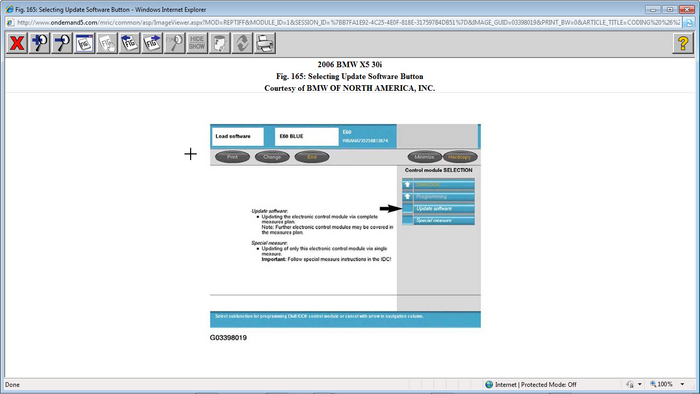 By selecting "Update Software" a measures plan will be generated that will indicate what updates if any are available not only for the DME but for all modules installed in the vehicle.