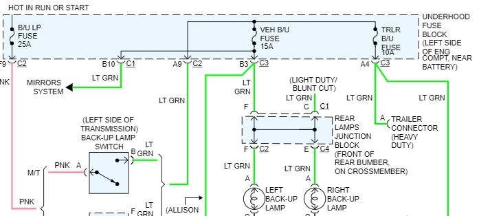 First, check to see if the fuses are good. There are two related to the circuit, a 15 amp back up fuse and a 25 amp back up lamp fuse. Both fuses are located in the under hood fuse block.