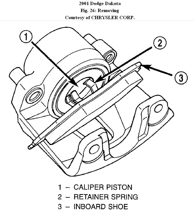 10. Remove inboard shoe by tilting shoe outward until retainer spring is clear of caliper piston. See Fig. 26.
