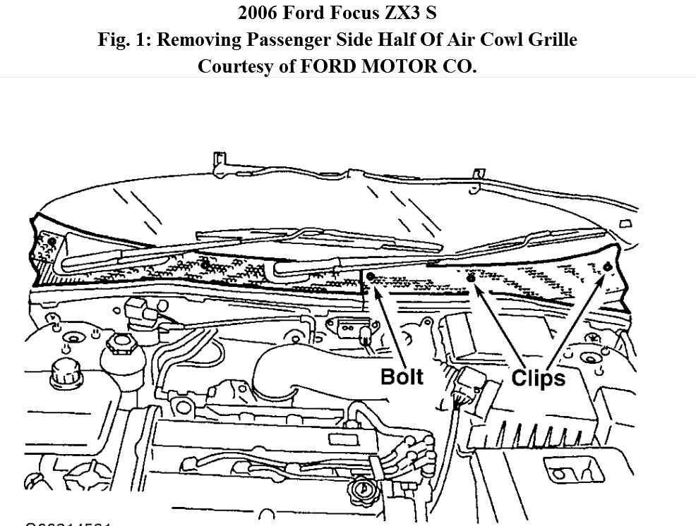 2. To detach the passenger side half of the cowl grille unclip the 2 clips, remove the cap and unscrew and remove bolt.