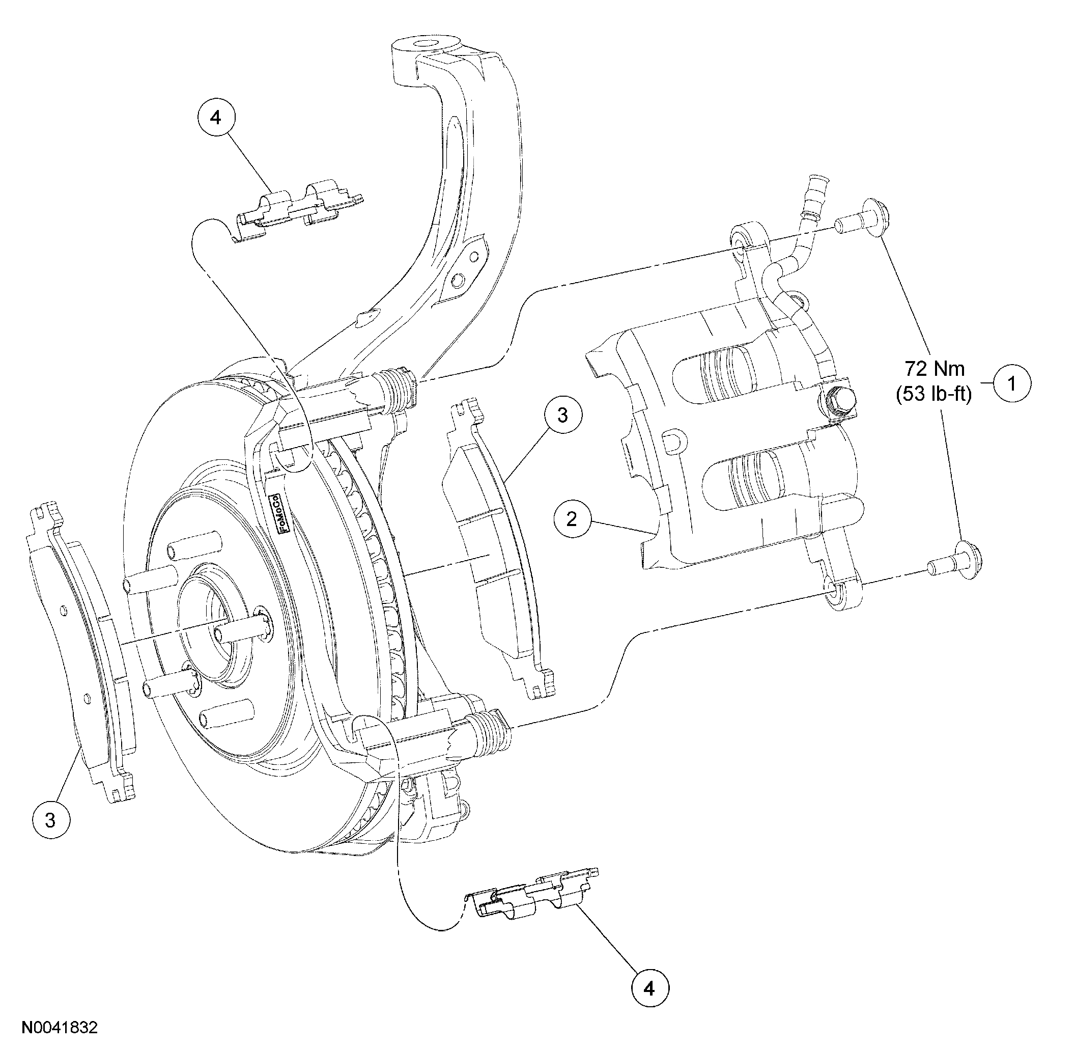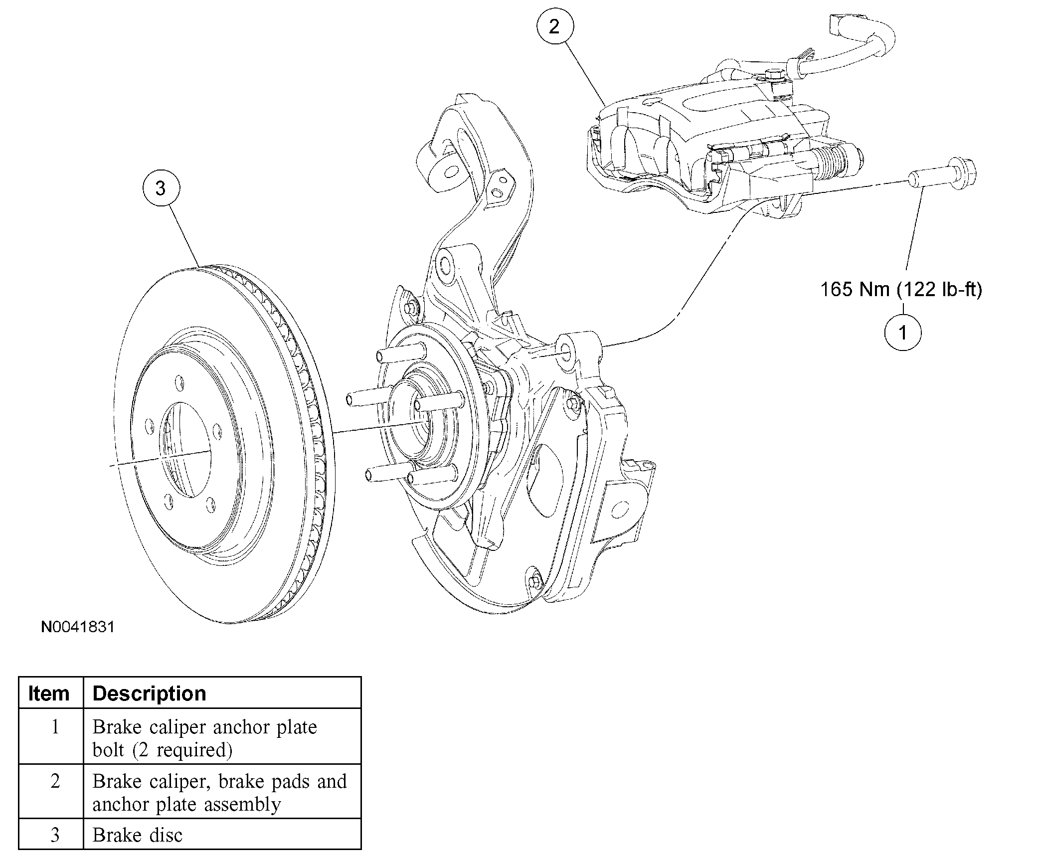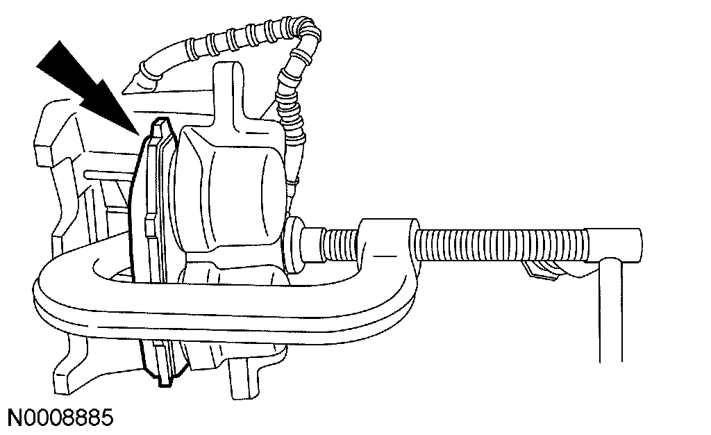 1. CAUTION: Do not allow the brake caliper, brake pads and anchor plate assembly to hang from the brake hose or damage to the hose can occur.
