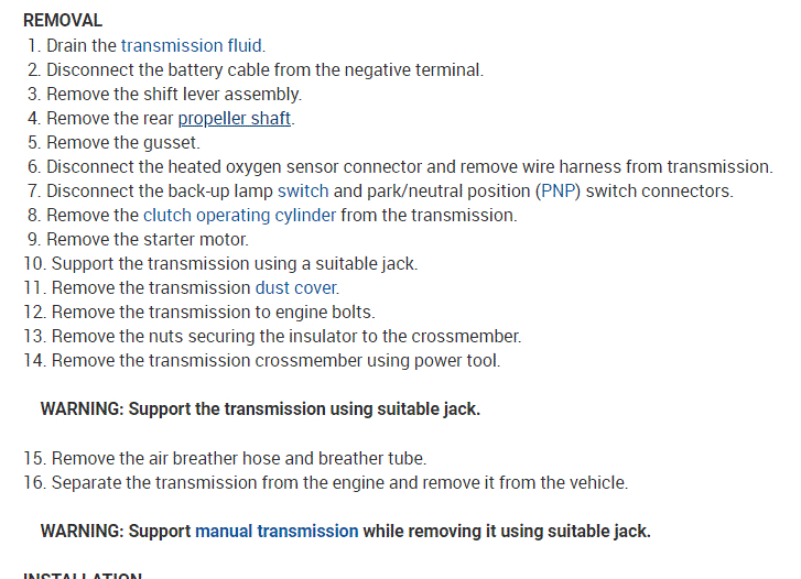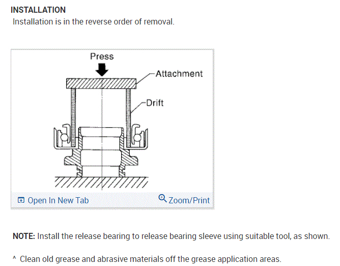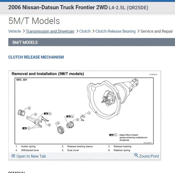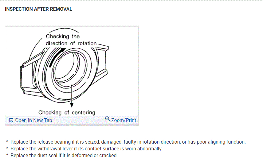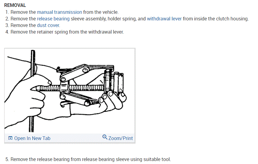If you look at the attachments below, they provide the directions specific to your vehicle for transmission removal, clutch and component inspection, release bearing replacement, and replacement.