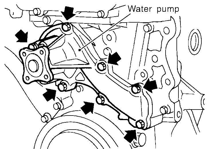 Remove liquid gasket from water pump and mating surface of cylinder block using a scraper.