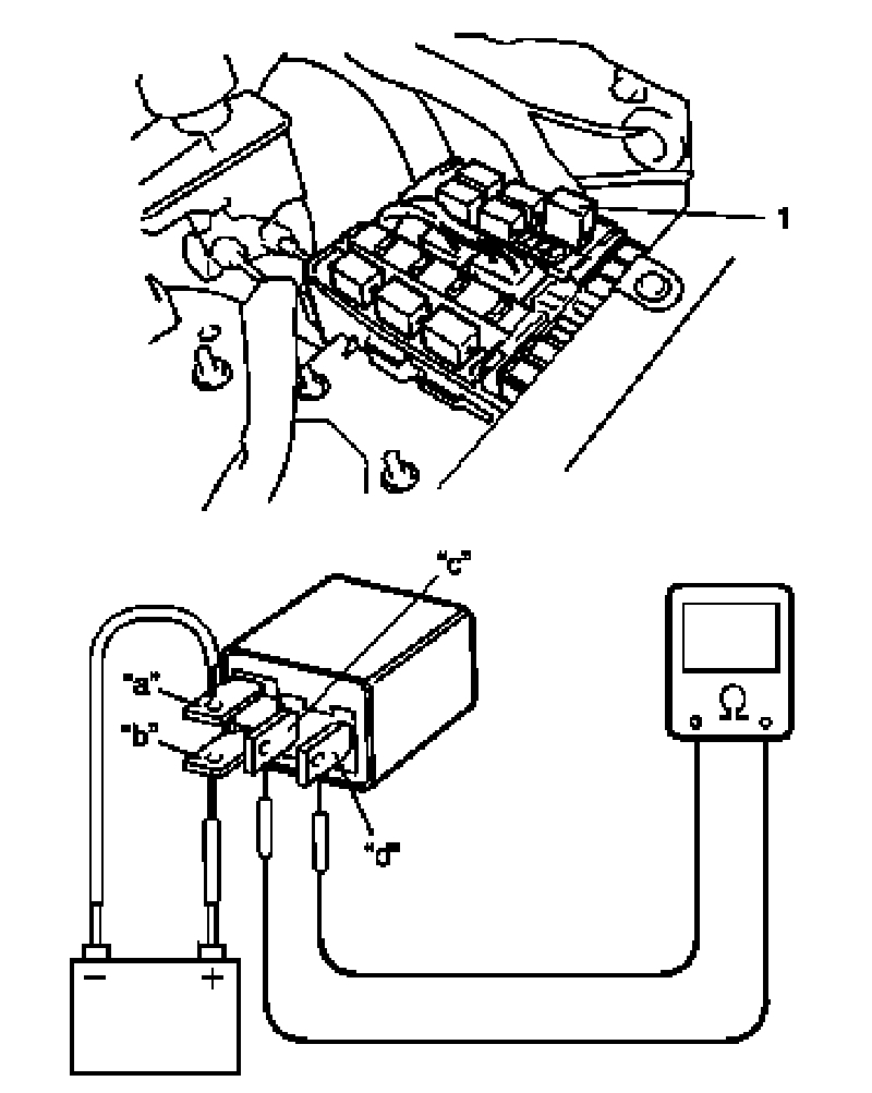 3. Check that there is no continuity between terminal "c" and "d". If there is continuity, replace relay.