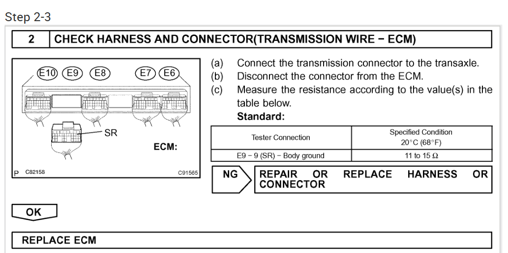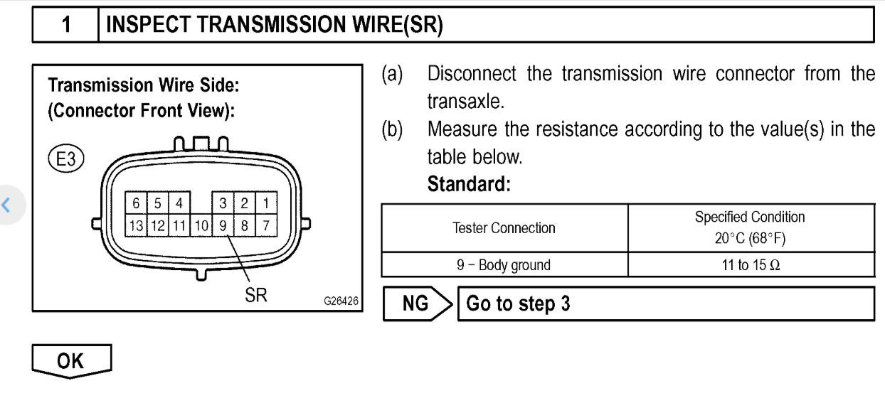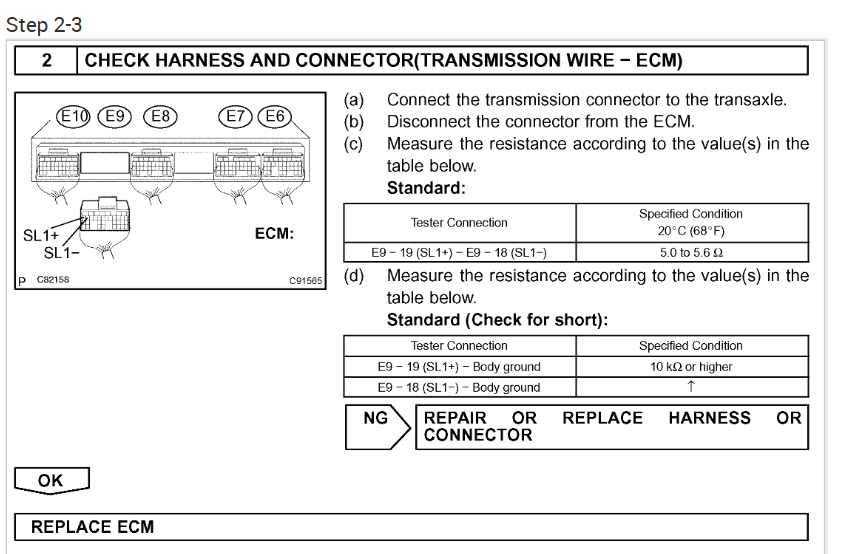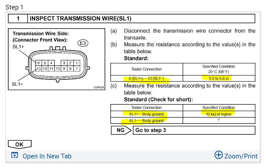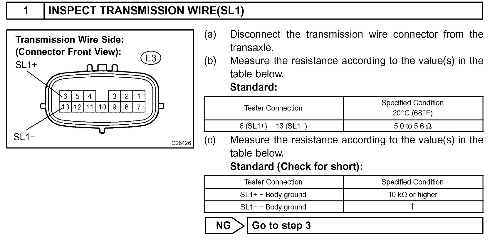 - Ck’d wire resistance from ECU plug to plug connection outside of the trans: 6.4 Ohms