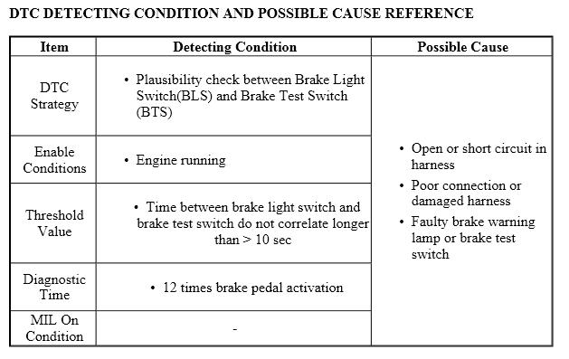 ECM sets DTC P0504 if the ECM detects signal of the brake warning lamp and brake switch are not correlate within the predetermined time.