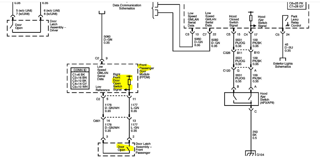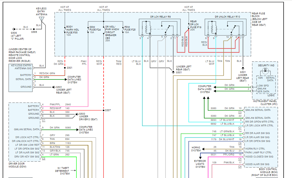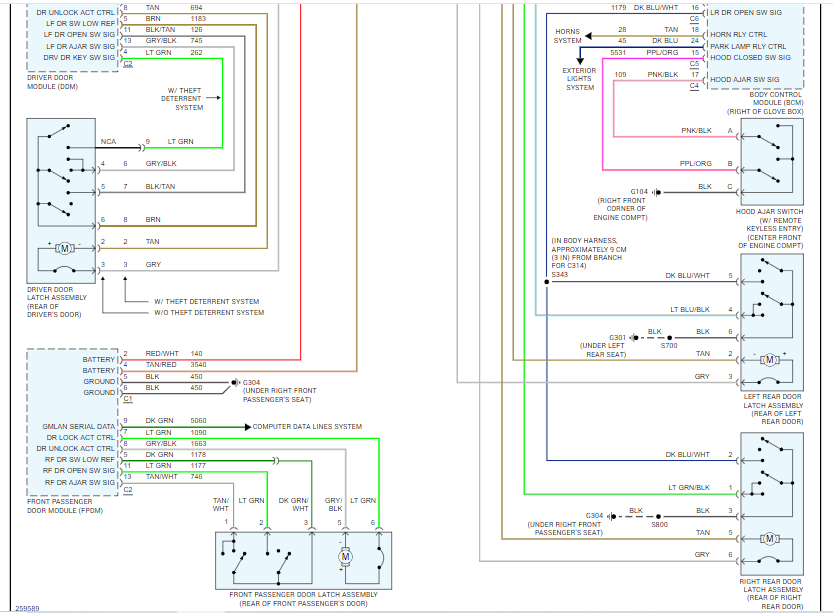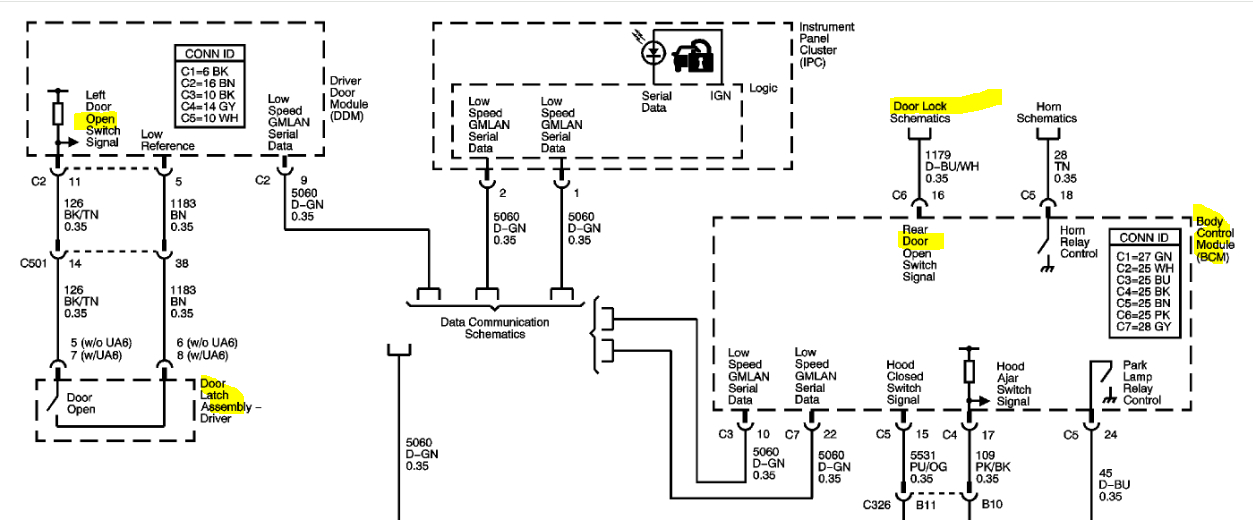 The first two pics below are the wiring schematic you are looking for. They includes the door sensors and related wiring. I had to cut the schematic in half to make it readable, but I did overlap them so they are easier to follow.