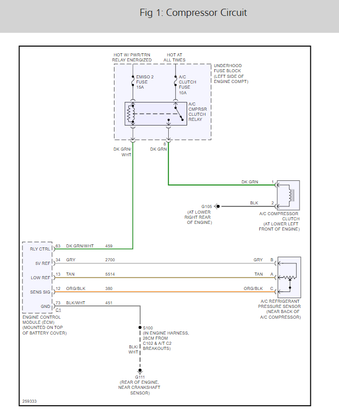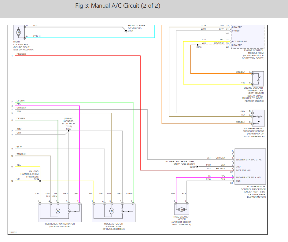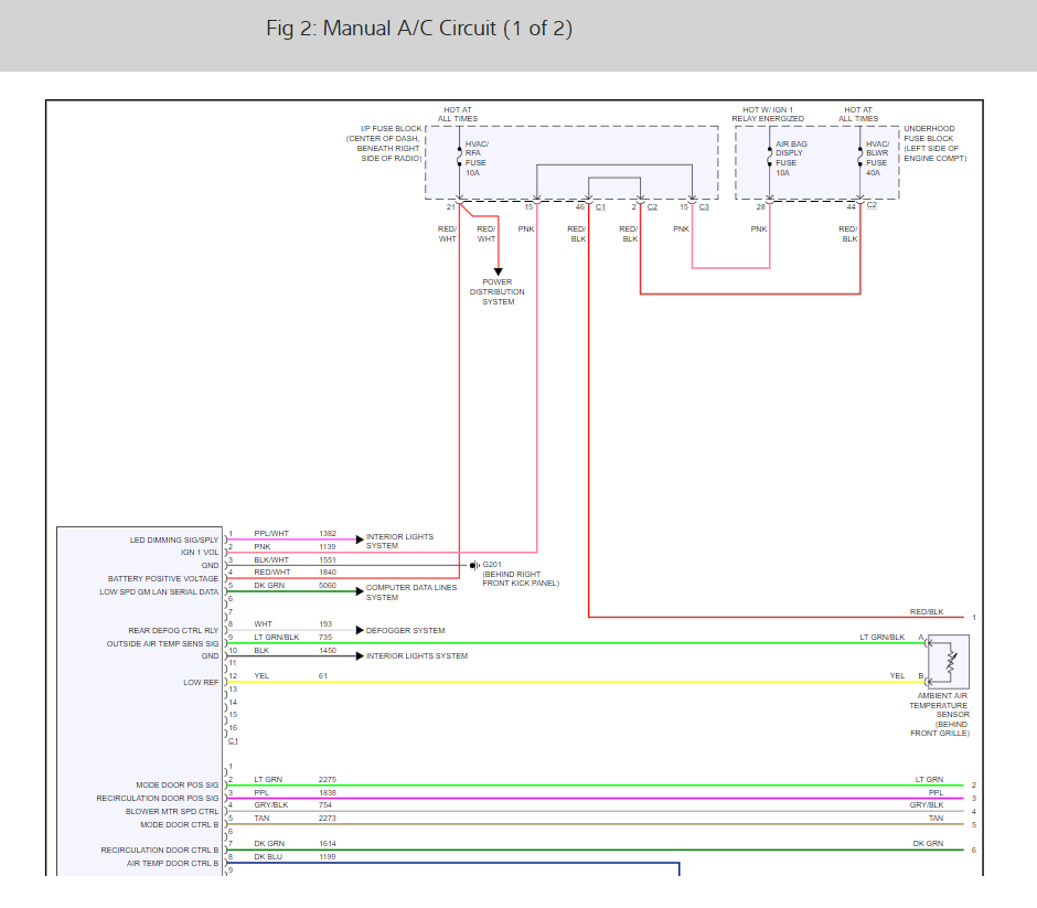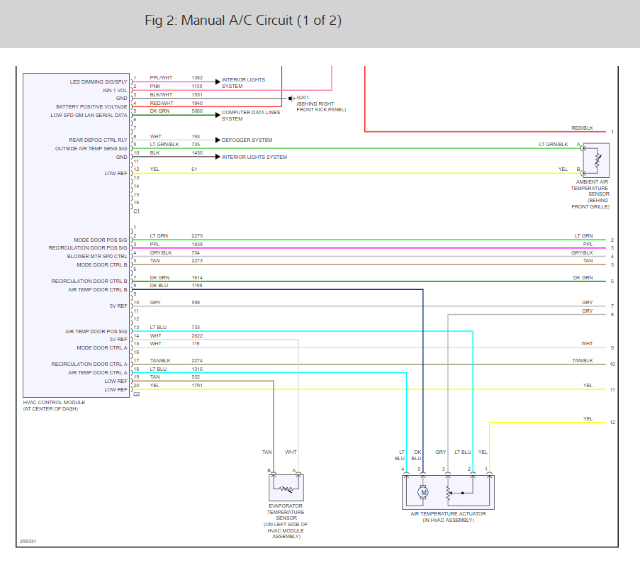 DO NOT replace the evaporator temperature sensor for this condition unless diagnosis proves it to be the root cause. The sensor can be checked for proper function using the Tech 2 Â. Check the sensor for volts varying around 2.3V to 2.6V. This data is within the BCM and is displayed in the accessory list. If the volts are near zero, check for a good connection at the sensor. Also, inspect the harness for possible damage. The sensor is located on the driver's side of the HVAC module and can be accessed from underneath the instrument panel by removing the closeout panel and OnStar  module, if equipped.