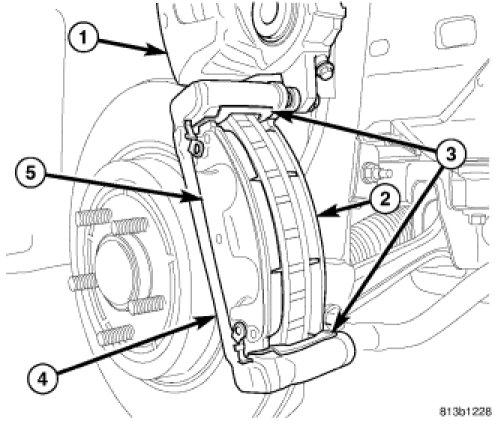 3. Install NEW inboard (2) and outboard (5) brake pads on caliper adapter (4). NEW Inboard and outboard pads are interchangeable.