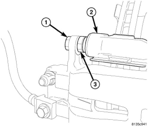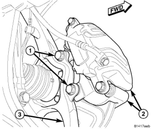6. Install Upper caliper guide pin bolt (1). While holding guide pin (3) stationary tighten bolt to 60 Nm (44 ft. lbs.).