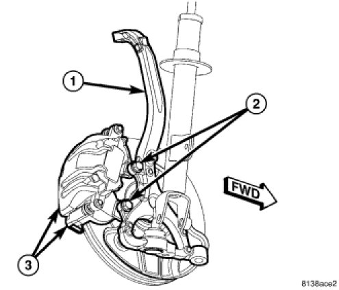 6. RWD - Install mounting bolts (2) securing caliper adapter (3) to knuckle (1). Tighten bolts to 95 Nm (70 ft. lbs.).