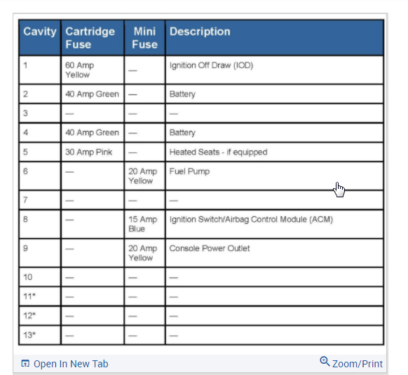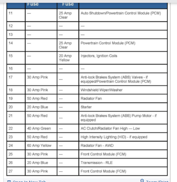 Below is the detail from the fuse boxes. Please run through this and let us know if you have other questions. Thanks
