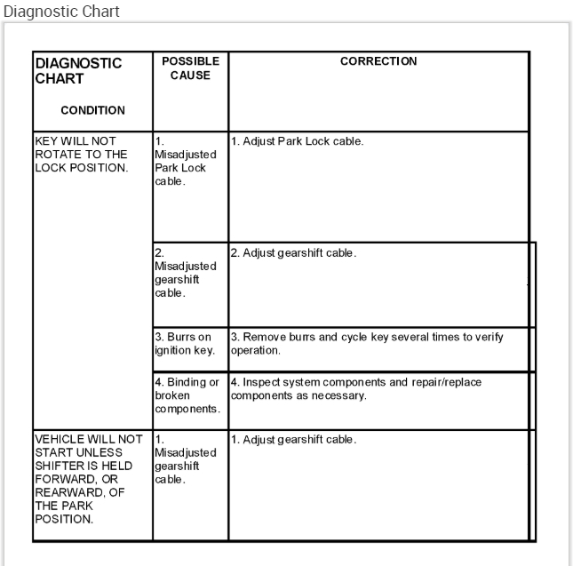 2. When the shift lever is in PARK, the ignition key cylinder should rotate freely from ACC to LOCK. When the shifter is in any other gear or neutral position, the ignition key cylinder should not rotate to the LOCK position.