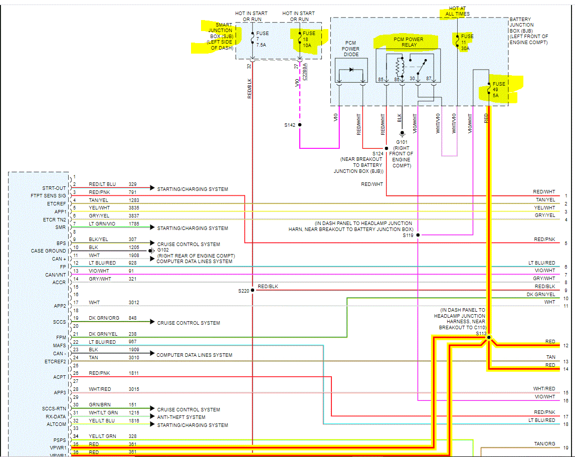 First, confirm the fuses are good in pic 1 (highlighted) If you look at the last two pics, I highlighted the fuses and the PCM power relay. Confirm fuses are good, there is power to and from them and then check the relay. Here are a couple of links you may find helpful: