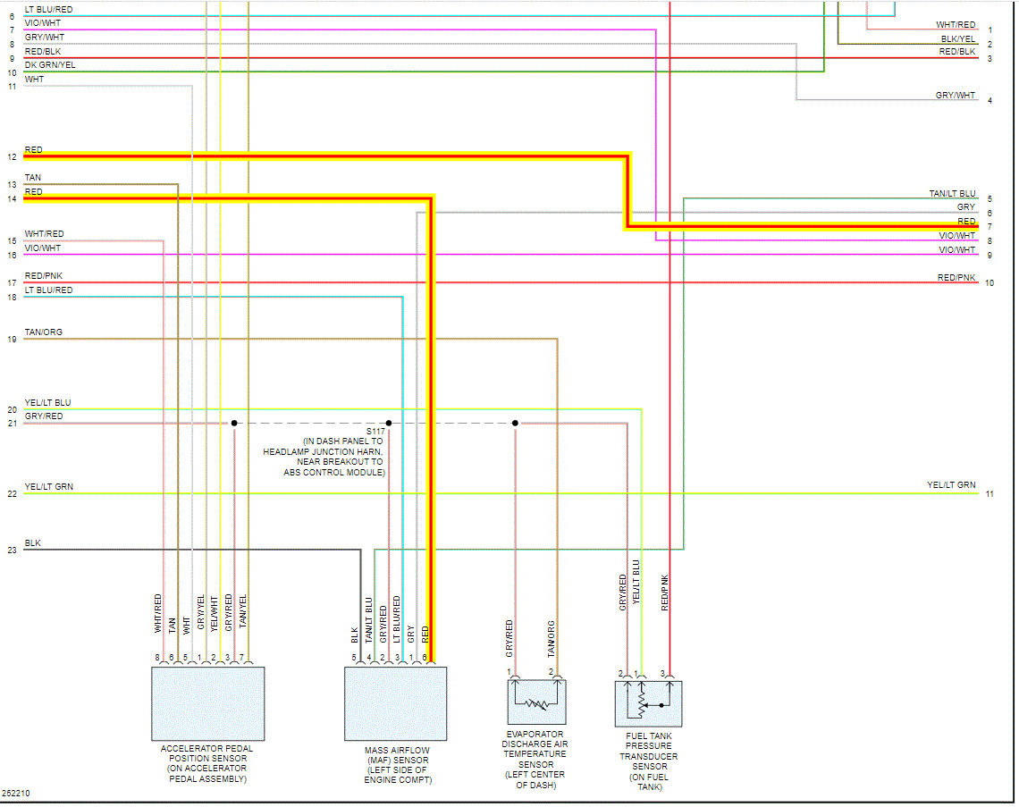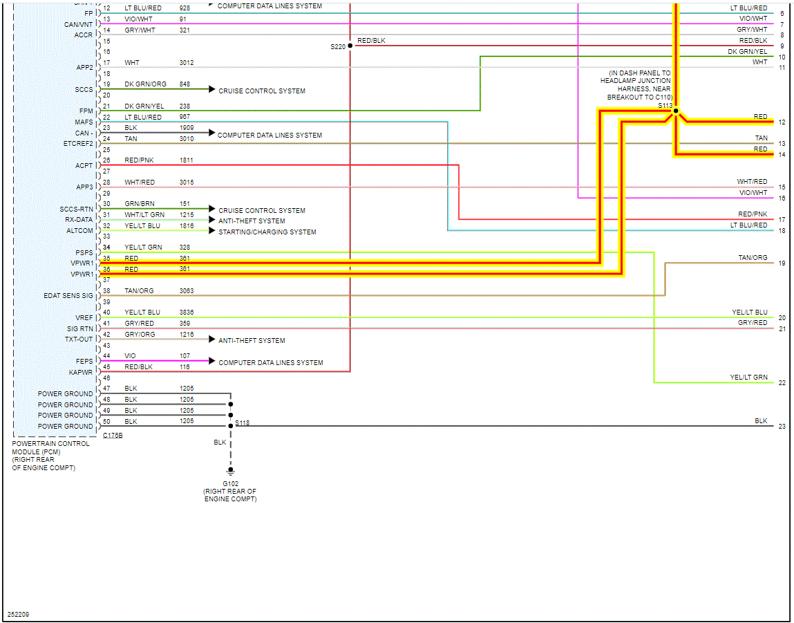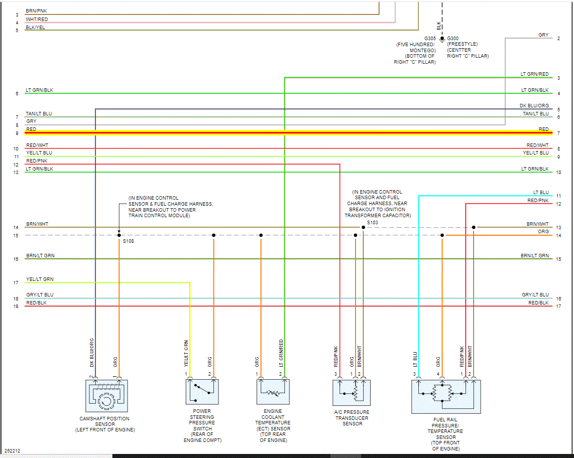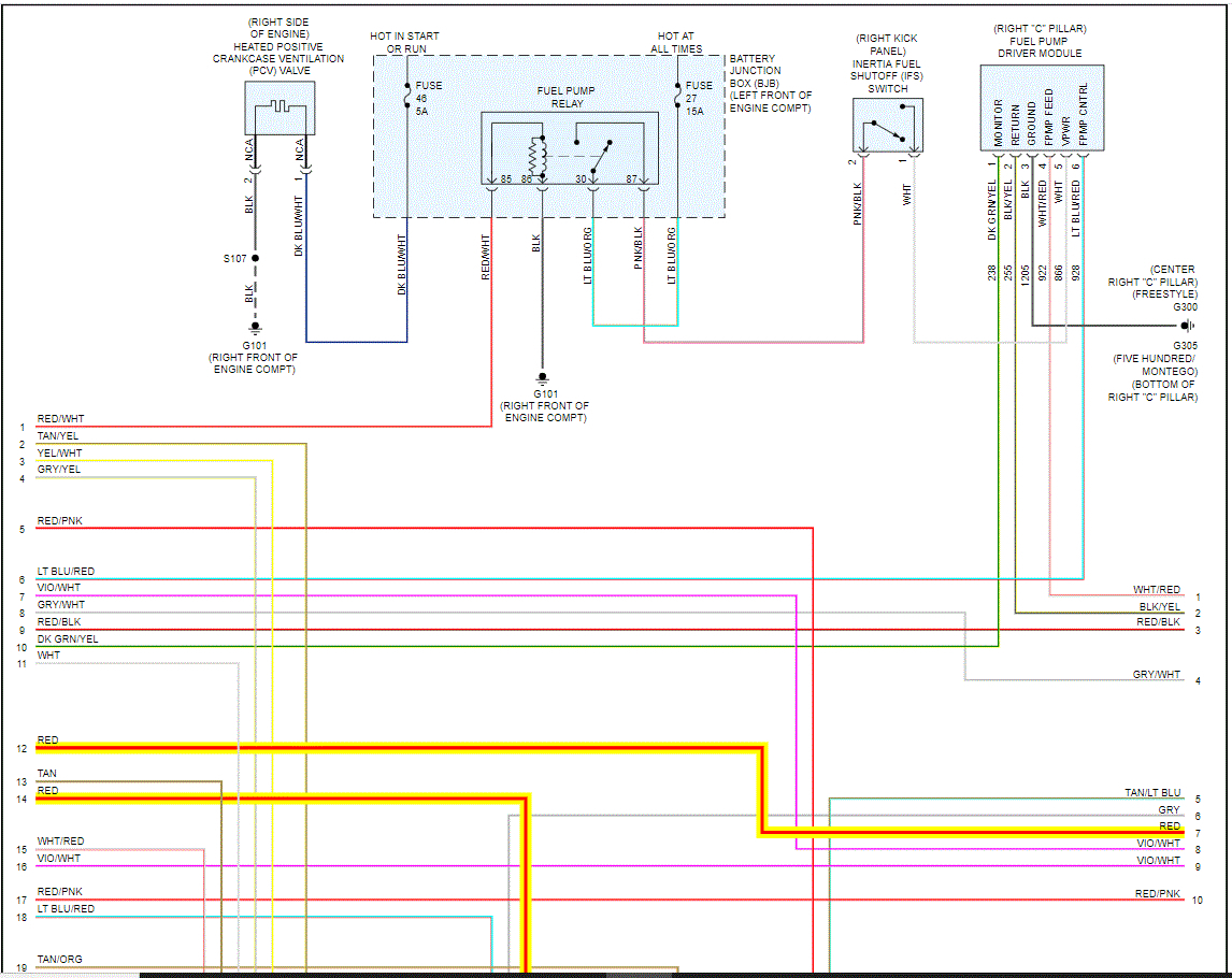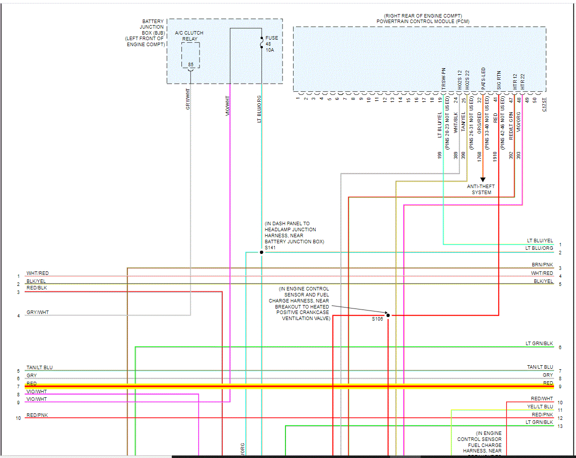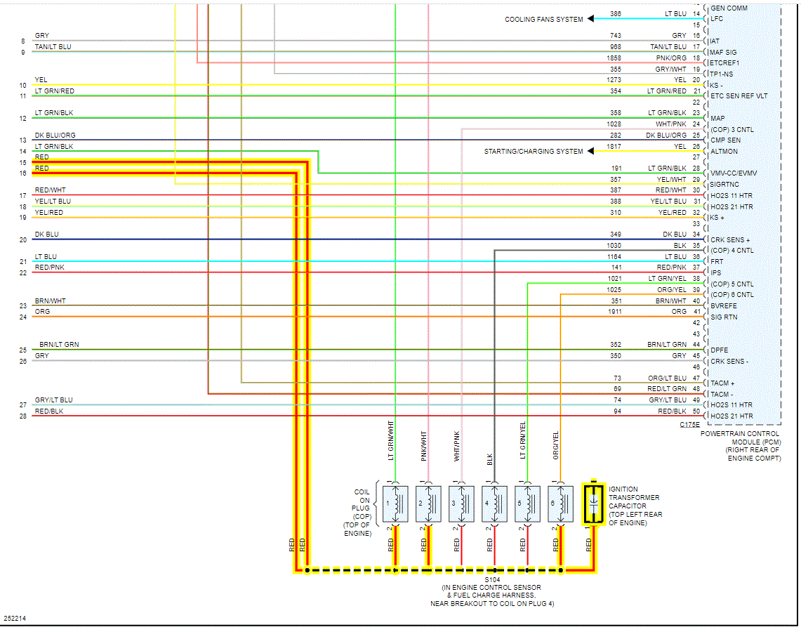 If you look below, I provided the entire wiring schematic for the powertrain management. There was a total of six pages, but I had to cut them in half to make them readable for you. I did overlap them so you can follow from one to the next. Also, I highlighted the power supply to the fuel injectors and the ignition coils.