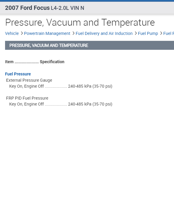 With the key on and engine off this vehicle should have 35-70 PSI of fuel pressure.