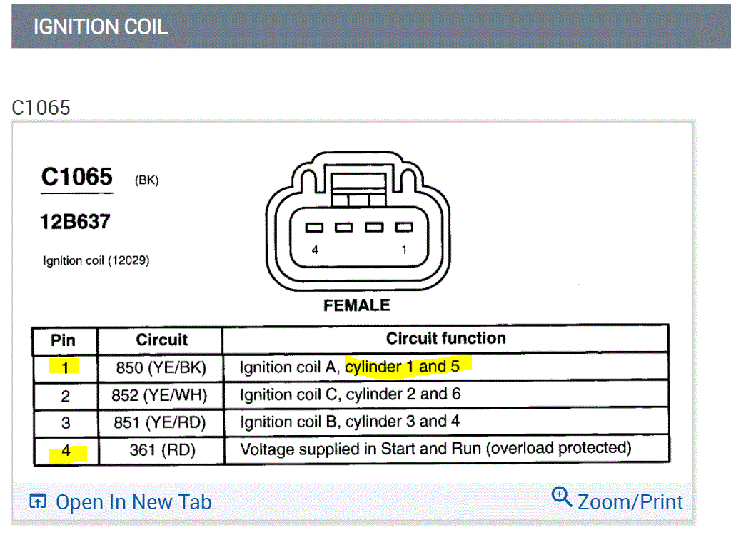 The PCM provides a ground path at specific times for the plugs to receive spark. On this vehicle, cylinders 1 and 5 receive spark at the same time from the same coil pack. For the coil pack ignition system, each coil within a pack fires 2 spark plugs at the same time. The plugs are paired so that as one fires during the compression stroke the other fires during the exhaust stroke. The next time the coil is fired the situation is reversed. So, in theory, if cylinder 1 is getting spark, cylinder 5 should be as well. (See pic 1 below for connector information) Notice on the connector there is only one connection for coils 1 and 5.