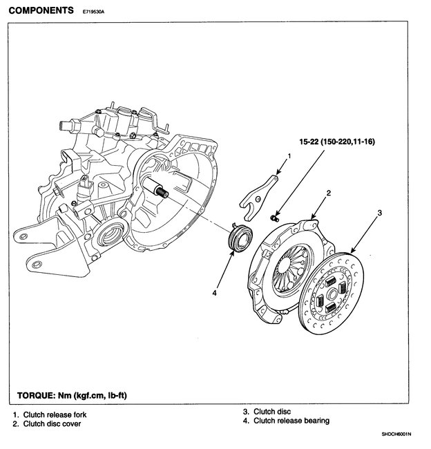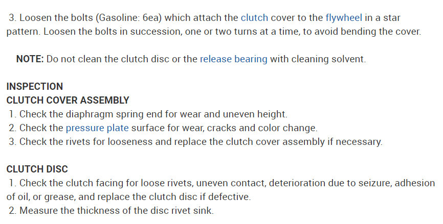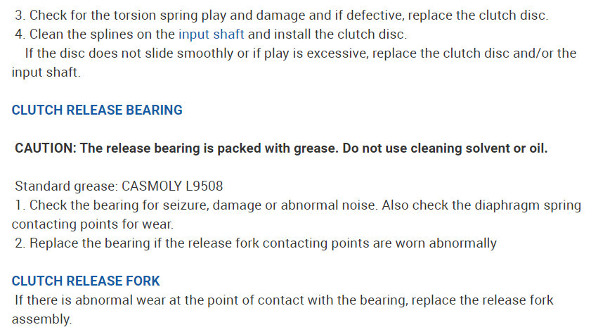 1. Check the bearing for seizure, damage or abnormal noise. Also check the diaphragm spring contacting points for wear.